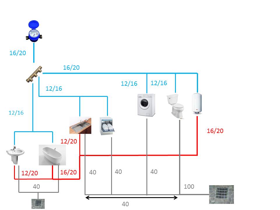Si vous préférez utiliser une distribution piquage, qui est le plus adapté, sortez du ballon en 16/ 20 et continuez avec ce diamètre jusqu'au té de la baignoire, puis alimentez baignoire et lavabo en tubes 12/16.