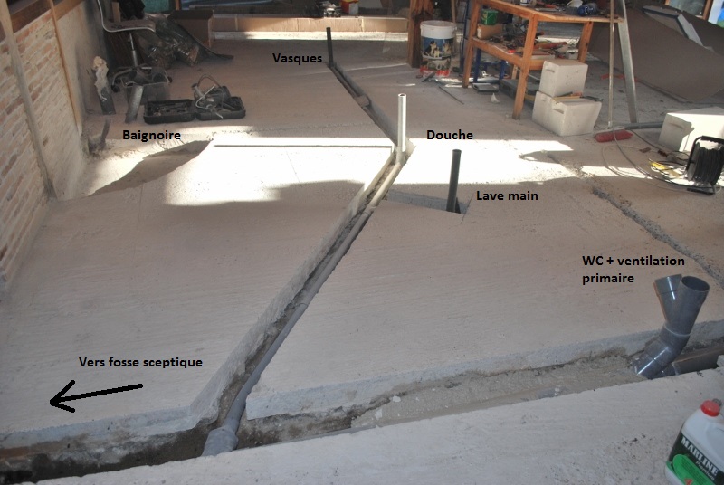 Je conçois actuellement les évacuations de toute la maison, évacuations qui seront placées dans des tranchées que je dois faire dans la dalle, pente à 2% sur lit de sable.