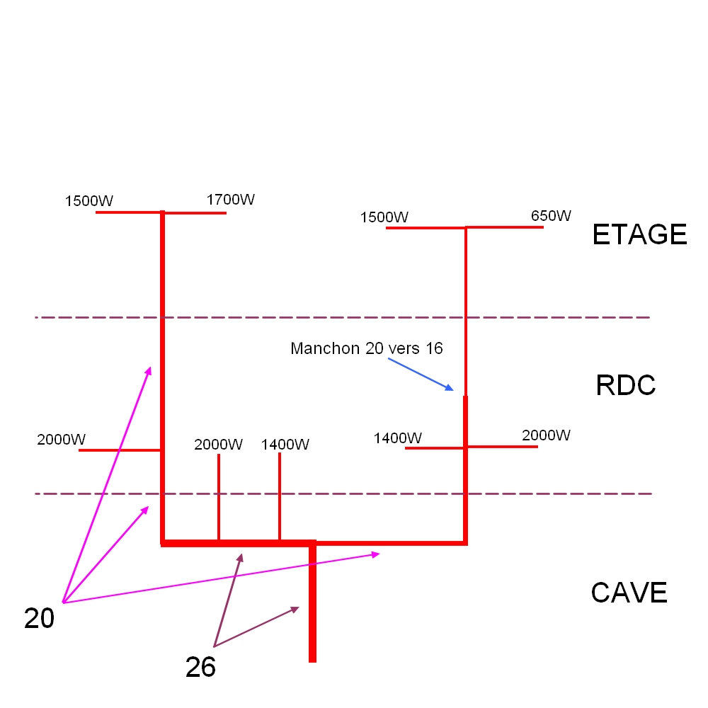 J'avais déjà un schémas correct mais j'ai été obligé de m'adapté par rapport aux passages possibles dalles et murs... Tous ce qui n'est pas noté "26" ou "20", c'est des tubes en "16".