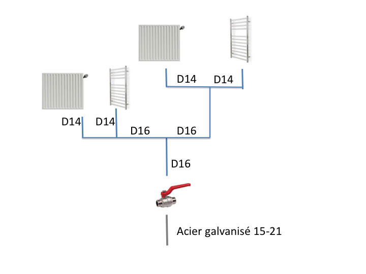 Pouvez-vous s’il vous plait valider ou non le choix des diamètres des tuyaux de cuivre dans mon schéma ? Un plombier m’a dit que ce serait mieux de faire tout en D16 mais en rénovation c’est trop dur.