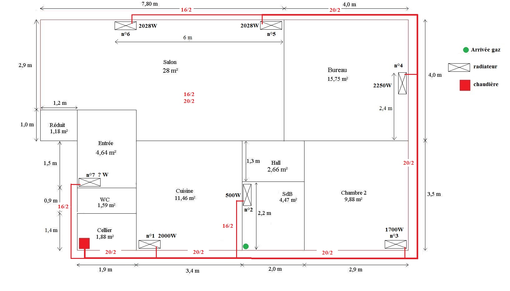 Donc pour une installation actuelle de 10608 watts (sans le radia n°7) avec un delta T de 15°c il nous faut 610l/mn au total départ chaudière.