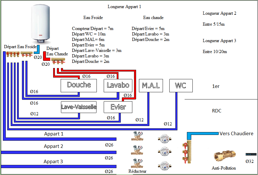 Mon soucis principal est la perte de pression sur le 2eme et 3eme appartement car plus on va et plus les distances augmentent surtout pour le 3eme ou j'arrive a plus de 20m pour certains appareils. Je me dis que je peut mettre un surpresseur dans le pire des scenarios mais peut on palier ca avec un diamètre plus gros du compteur a la nourrice de depart du 3eme appart ? Ou tout simplement régler le réducteur de pression, vu que je les passerai en individuel, plus haut en pression pour pallier la perte du a la longueur ?