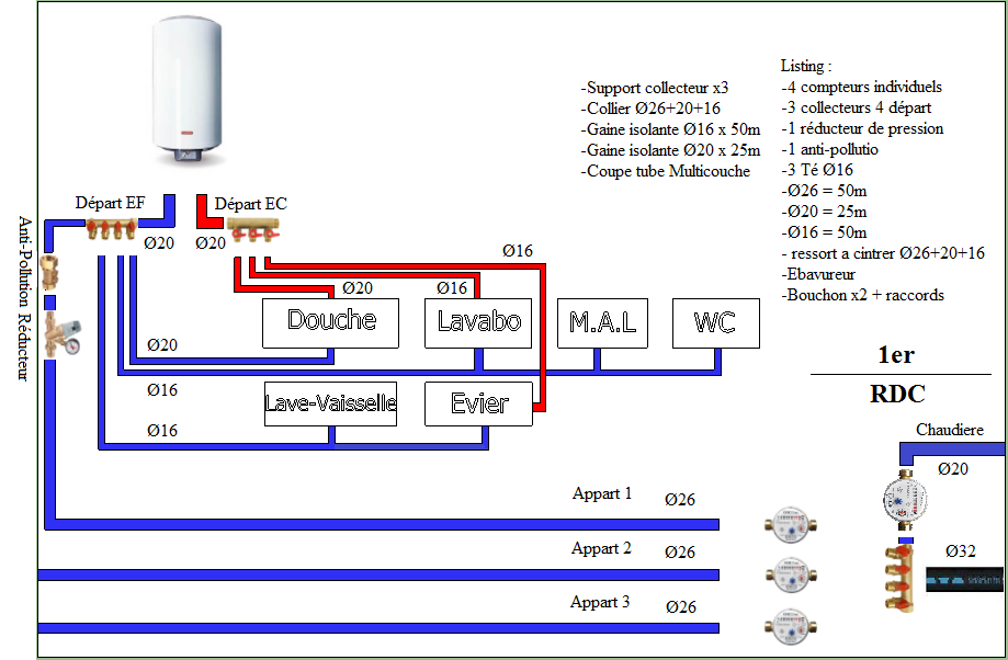 -Pour les diamètres je parle en diamètre extérieur uniquement, si je met un diamètre de 20/26 du compteur a la nourrice de depart c'est pour pallier la perte de pression du a la longueur mais c'est peut être inutile.. Il y aura une nourrice principal pas de secondaire et vous préconisez du 12/16 pour tous les appareils (meme MAL,WC ?) sauf baignoire ou douche hydrojet en 16/20 c'est ca ?
