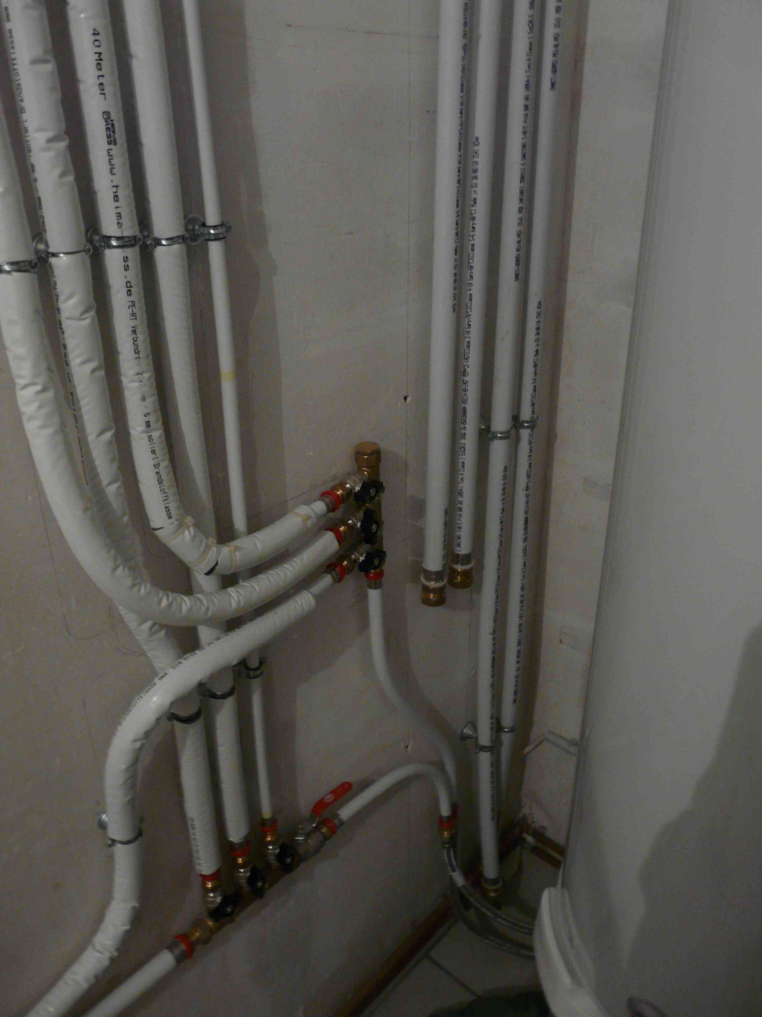 Précision: les gros tubes de 32 sur la droite sont ceux du circuit de chauffage (suite au remplacement de la chaudière en 2010), tout comme ceux en cuivre (circuit de chauffage central initial). Parmi eux, les deux tubes en attente seront un jour peut-être raccordés à un préparateur ECS.