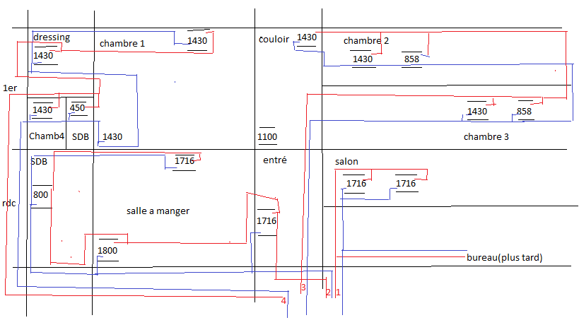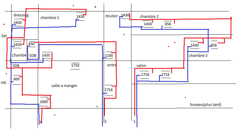 J'aurais souhaiter alimenter mes radiateur par de boucles en mini colonnes(les radiateurs situé aux fenetres sont les uns aux dessus des autre) pour faires des boucles simples et pour éviter les différence de pressions trop importante entre les boucles et par simplicité pour passer les différentes portes je voudrais distribuer les radiateur haut et bas par des tuyaux en multicouche au niveau de la plainte du 1er(au ras du sol)