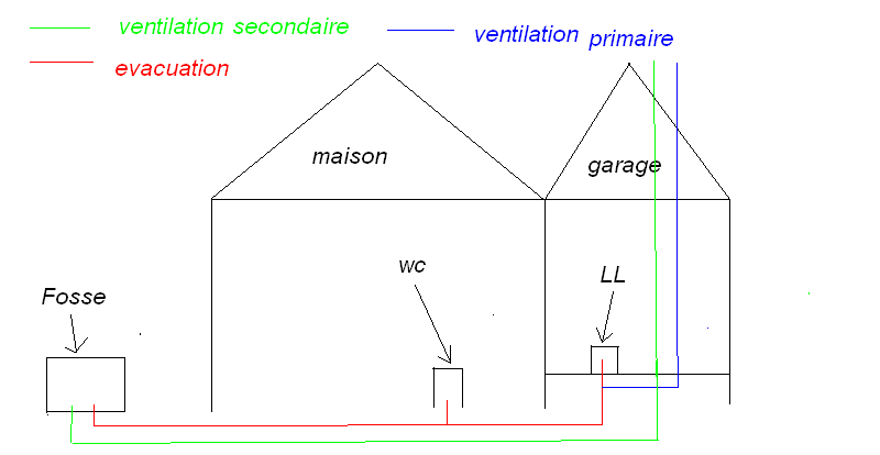 Ventilation primaire = prolongation du réseau d’évacuations vers la toiture permettant l'aspiration d'air.