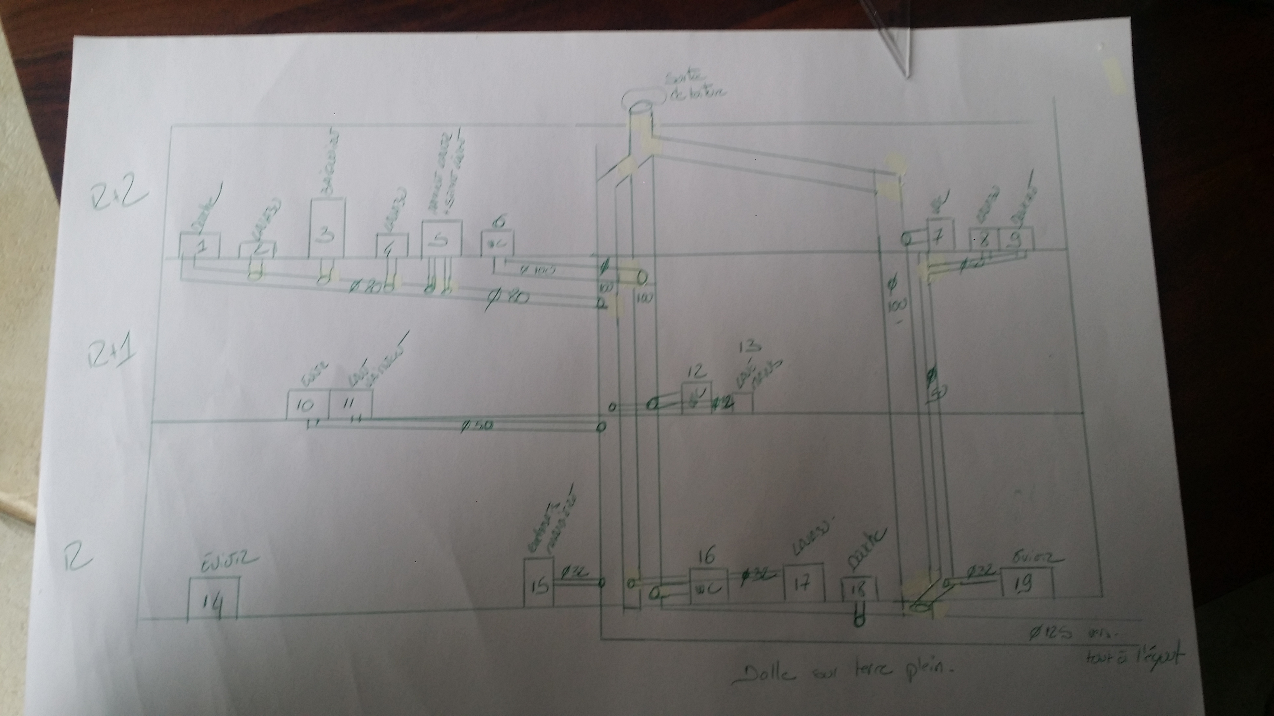 en PJ je joins les plans de la maison pour les 3 niveaux ainsi qu un premier schema de mes évacuations réalisé à main levée en ayant essayé de respecter les règles d'évacuation des eaux usées glanées sur le forum