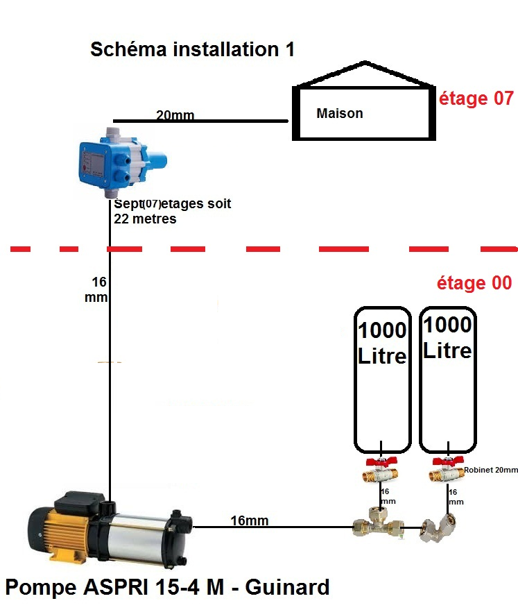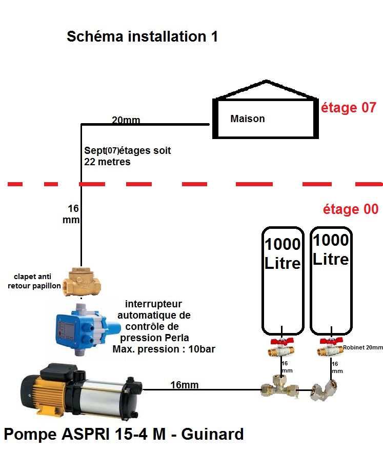 Voila, je viens de m'installer dans un appartement au 7em étage où l'alimentation en eau courante n'est pas encore établie, de ce fait, j'ai mis une installation provisoire selon le schéma suivant :