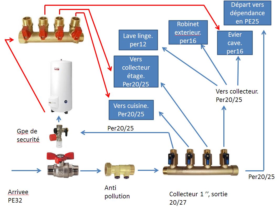 Dans la maison principale, je pensais mettre un collecteur avec vannes à l'arrivée d'eau et alimenter la dépendance avec la sortie 20/27 du collecteur et du PER 20 pour arriver jusqu'au départ du PE 25 qui relie la cave à la dépendance. Le PER ferait la jonction dans la cave entre l'arrivée d'eau de la maison principale et le départ vers la dépendance.