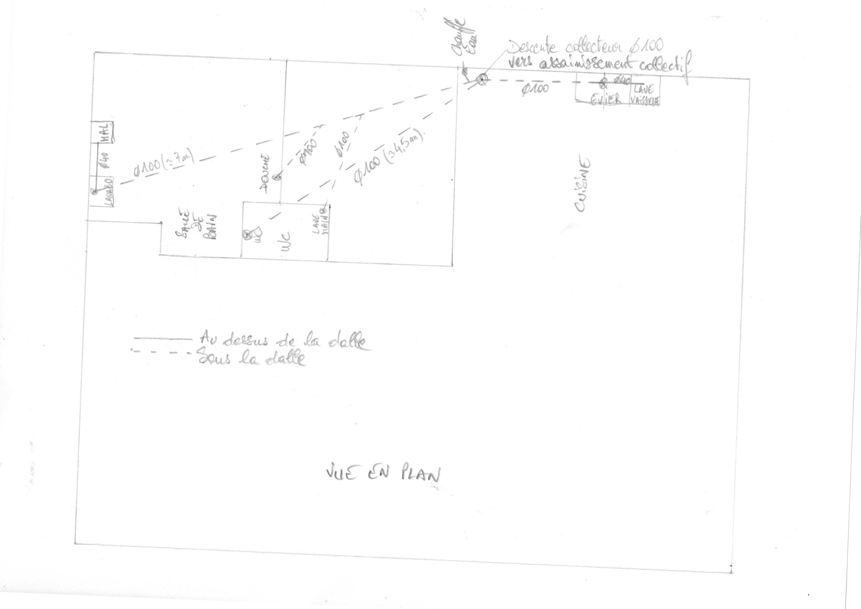 Pour l’évacuation du toilette: elle peut être raccordé sur le collecteur principal si ça vous arrange, autrement laissez comme dessiné.