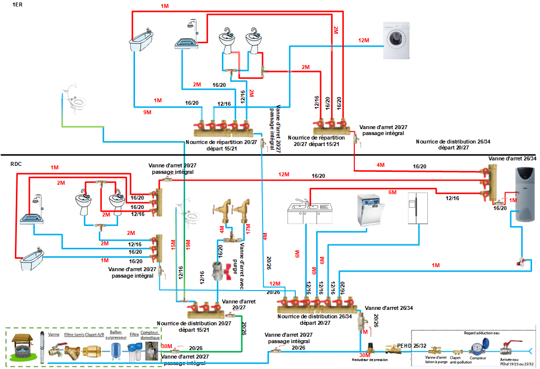 puis les raccords coté distribution en femelle diametre 26 et coté répartition en male