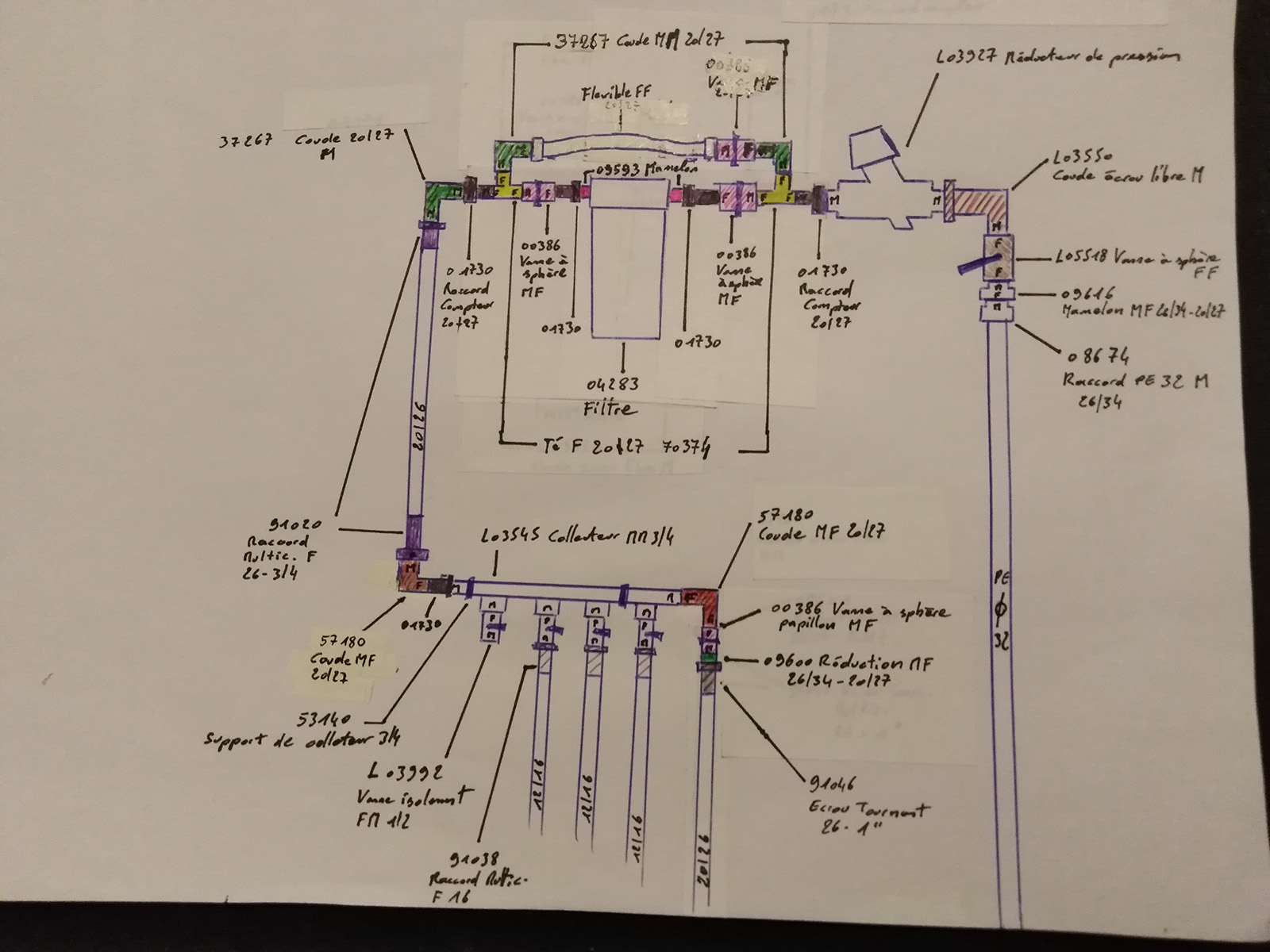 L'arrivée générale est en PE32. Ensuite réducteur de pression, filtre et collecteur (voir le schéma). Au bout de ce collecteur je comptais brancher un tuyau multicouche de 20-26 et l'amener jusqu'au chauffe-eau situé 6 mètres plus loin. Le chauffe-eau alimente un évier, deux douches et deux lavabos. Vous semblez penser que le tuyau est surdimensionné, n'est-ce-pas?