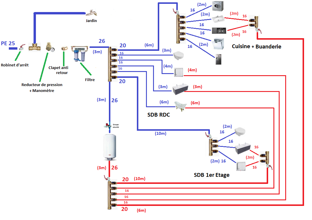 -Sur mon schéma global, quelle diamètre multicouche, 20 ou 26, je dois utiliser entre la station de filtrage et la 1ere nourrice d'eau froide? Je pensais au début prendre du 26 mais je me demande si ce n'est pas trop gros en sortie de station de filtrage.