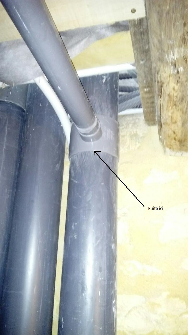 Il y a une fuite dans mon installation au niveau de la jonction évacuation de la douche (diametre 40) et collecteur eaux usées, comme indiqué dans la photo ci dessous.