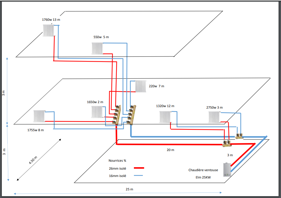Les anciens radiateurs en fonte vont être réutilisés, du multicouche de 26mm et de 16mm isolé sera employé avec des raccords à sertir ainsi que des nourrices en 3 /4 avec vanne.