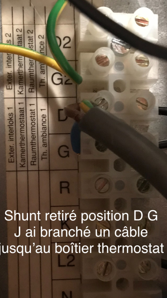 je le branche sur le bornier position D et G ( voir photo) à la place du shunt mais je n'ai pas l'impression que le thermostat commande le circulateur ni le bruleur .