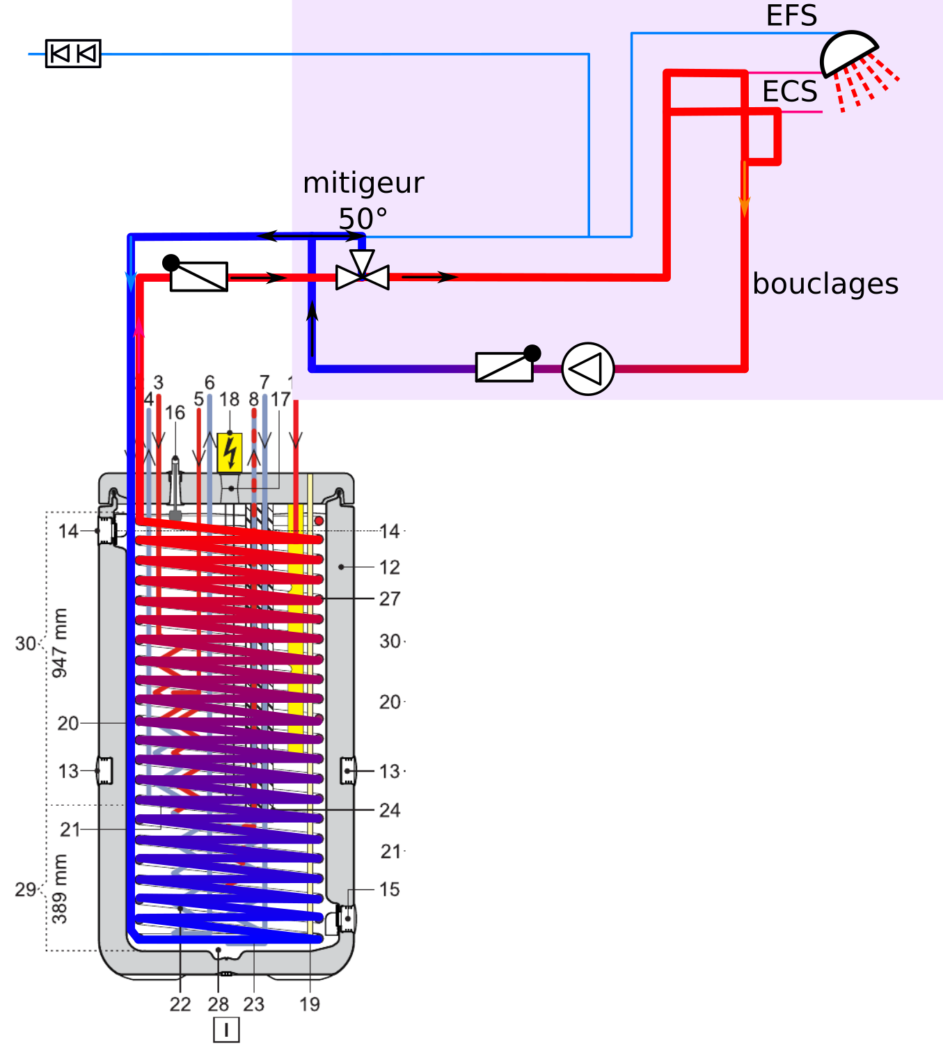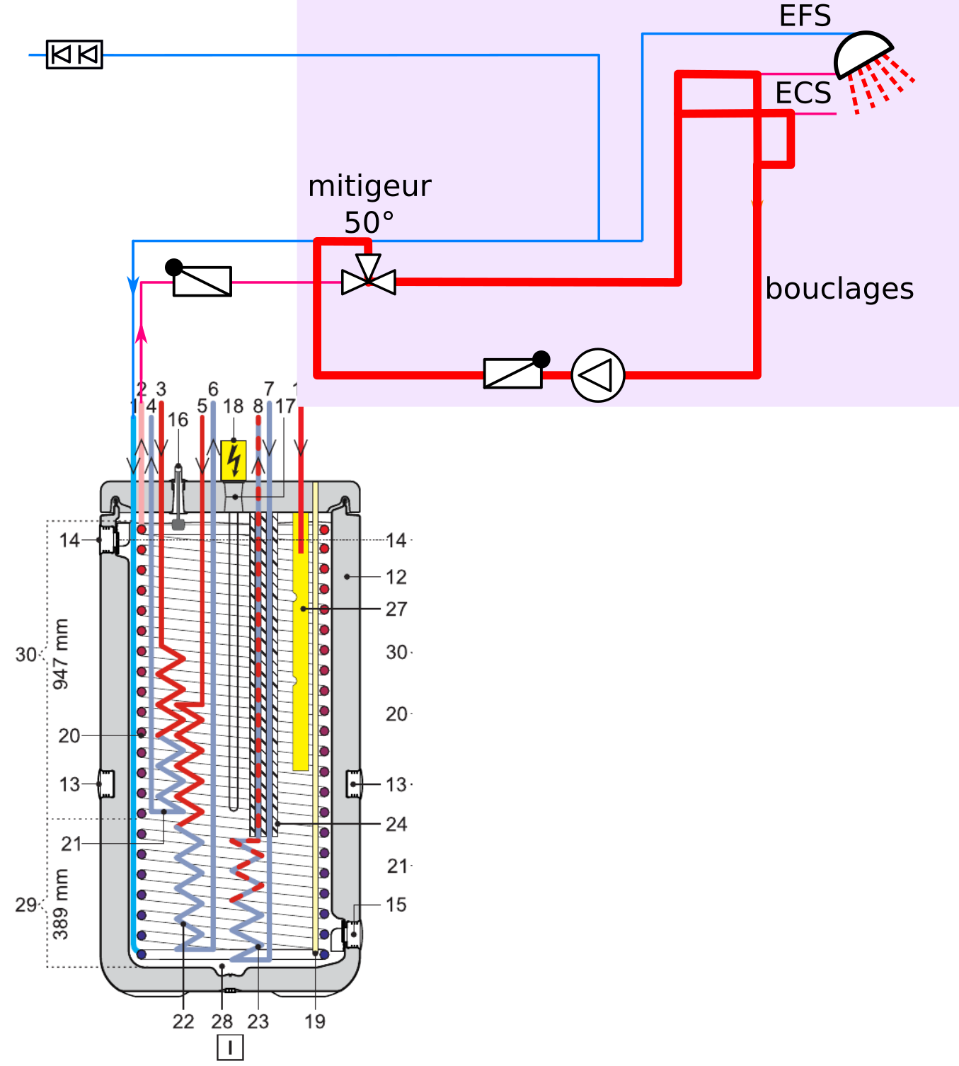• étape 2, le départ ECS est chaud mais le retour bouclage est tiède, de l'eau tiède entre par le bas du ballon et abîme la stratification le temps que la boucle soit chaude. J'espère que ce n'est pas long.