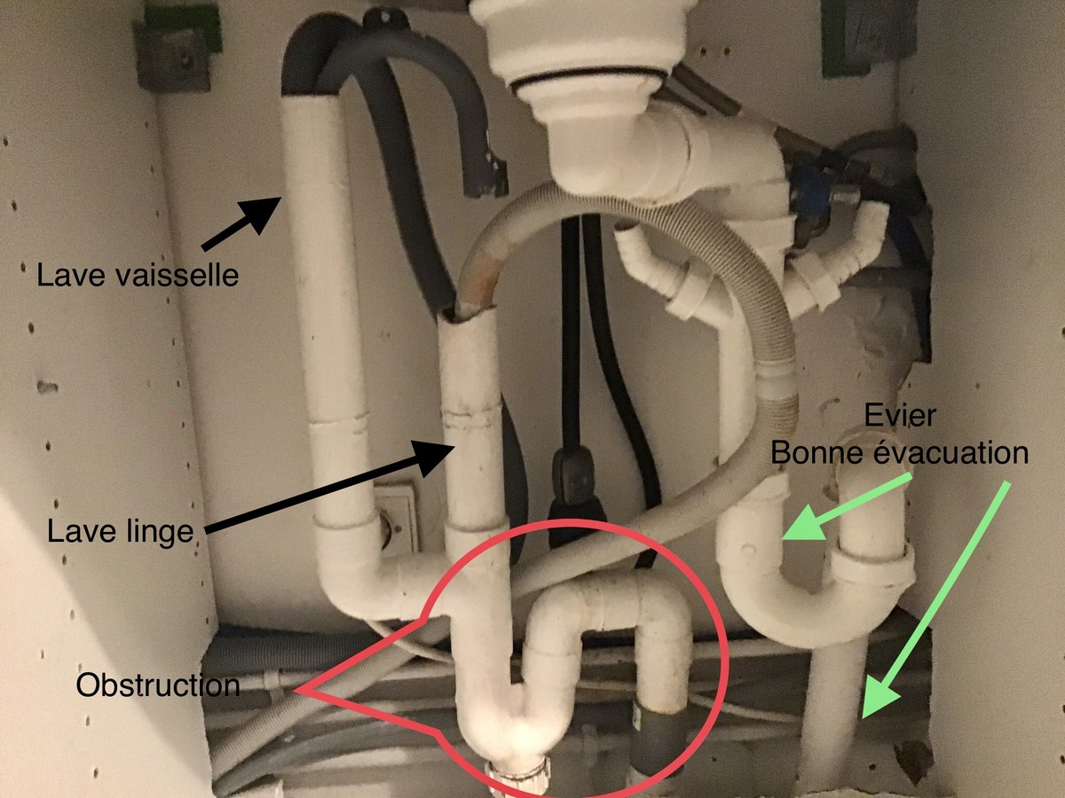 Finalement j'ai réussi à retirer l'ensemble évacuation des machines, au niveau du raccord, et à dévisser le bouchon du siphon. Et ô surprise, je n'ai pas trouvé d'obstruction dans cet ensemble.