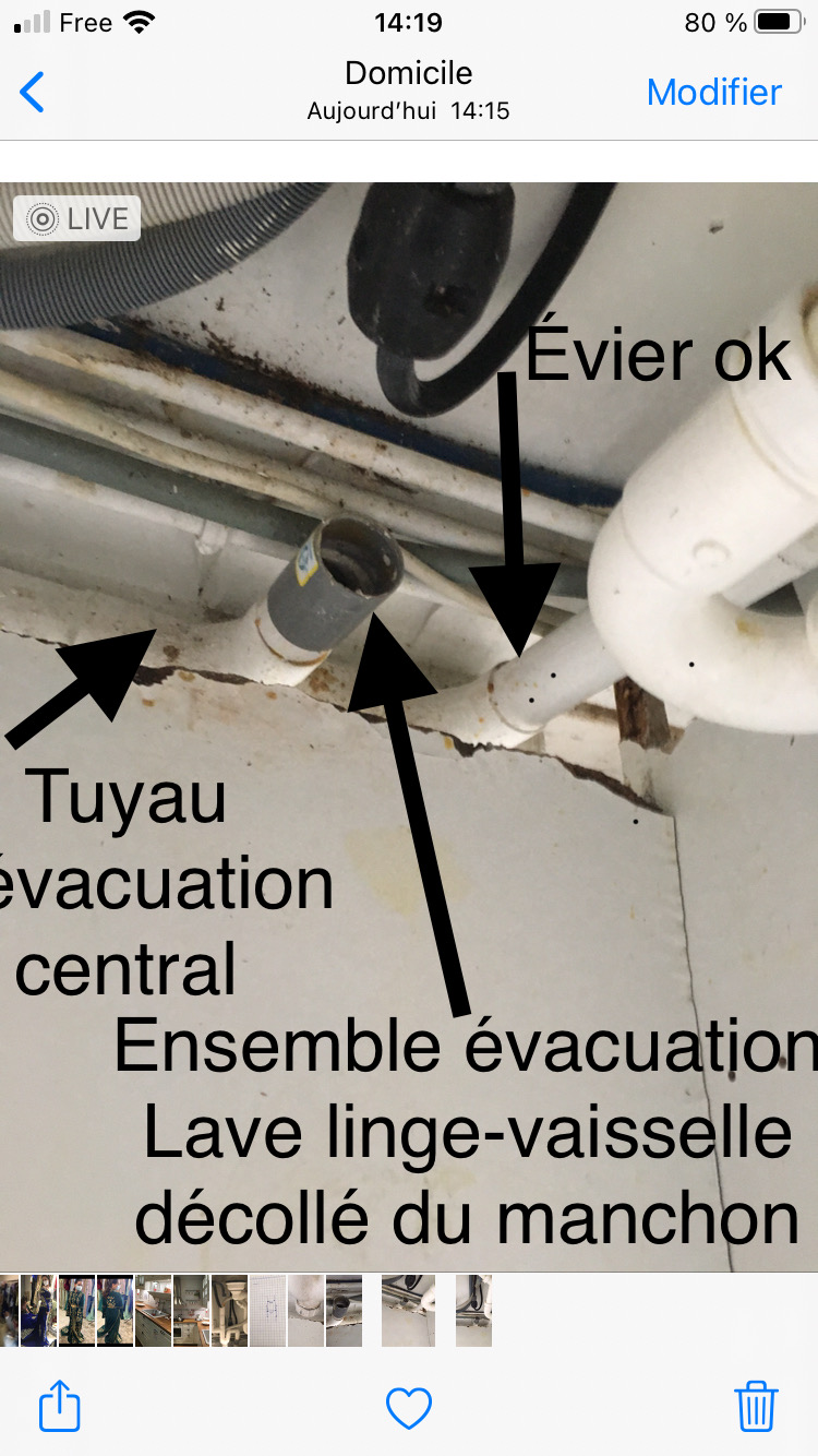 J’ai un système d’évacuation pour évier, lave linge, et lave vaisselle. L’évacuation  de l’évier fonctionne normalement, alors celle pour le lave linge et lave vaisselle est bouchée. Cette dernière a déjà été réparée par un raccord pvc. J’ai joins la photo pour que cela soit plus explicite.