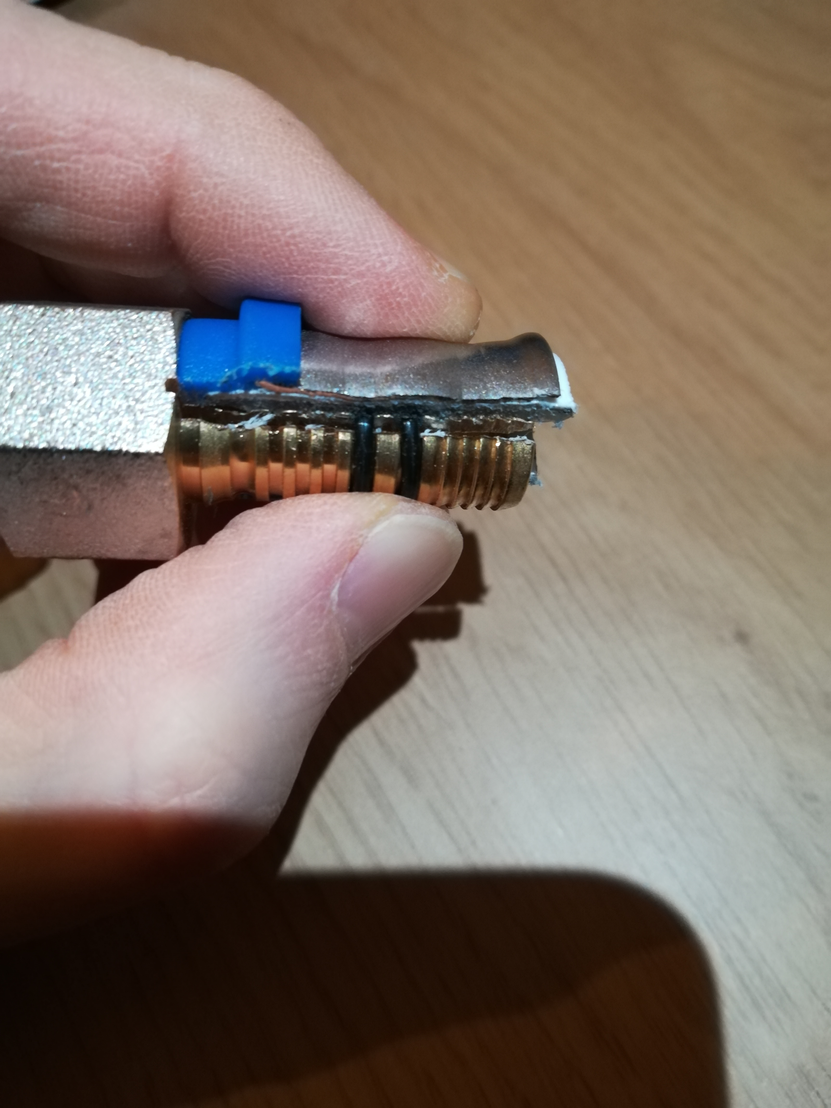 Et c'est là que j'ai un GROS DOUTE sur la fiabilité de ces sertissages : après découpe du raccord pour contrôle, un des joints est écrasé par une des stries de sertissage...