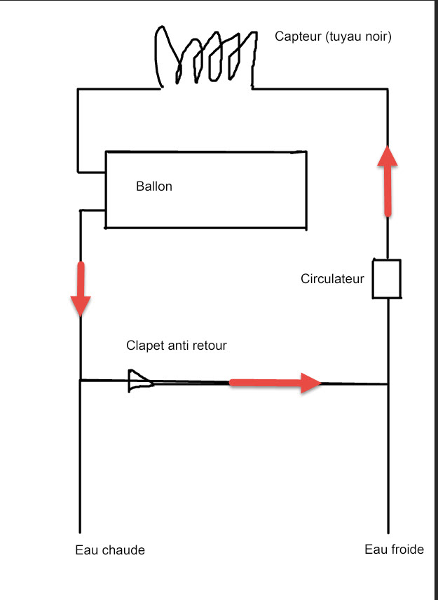 J'habite dans les 2 sevres, région plutôt chaude l'été. Pour l'été je voudrais chauffer l'eau sanitaire avec le soleil de façon très simple en mettant un tuyau noir sur le toit d'une dépendance. L'eau circulerait dans le tuyau et serait stockée dans un ballon. Pas de fluide caloporteur et donc vidange du tuyau l'hiver. Comme le ballon sera situé en dessous du tuyau capteur il n'est pas possible que l'eau circule par thermo syphon. Il faudrait donc que j'utilise un circulateur. Est-ce que le schema que je joins est correct? Qu'en pensez vous?