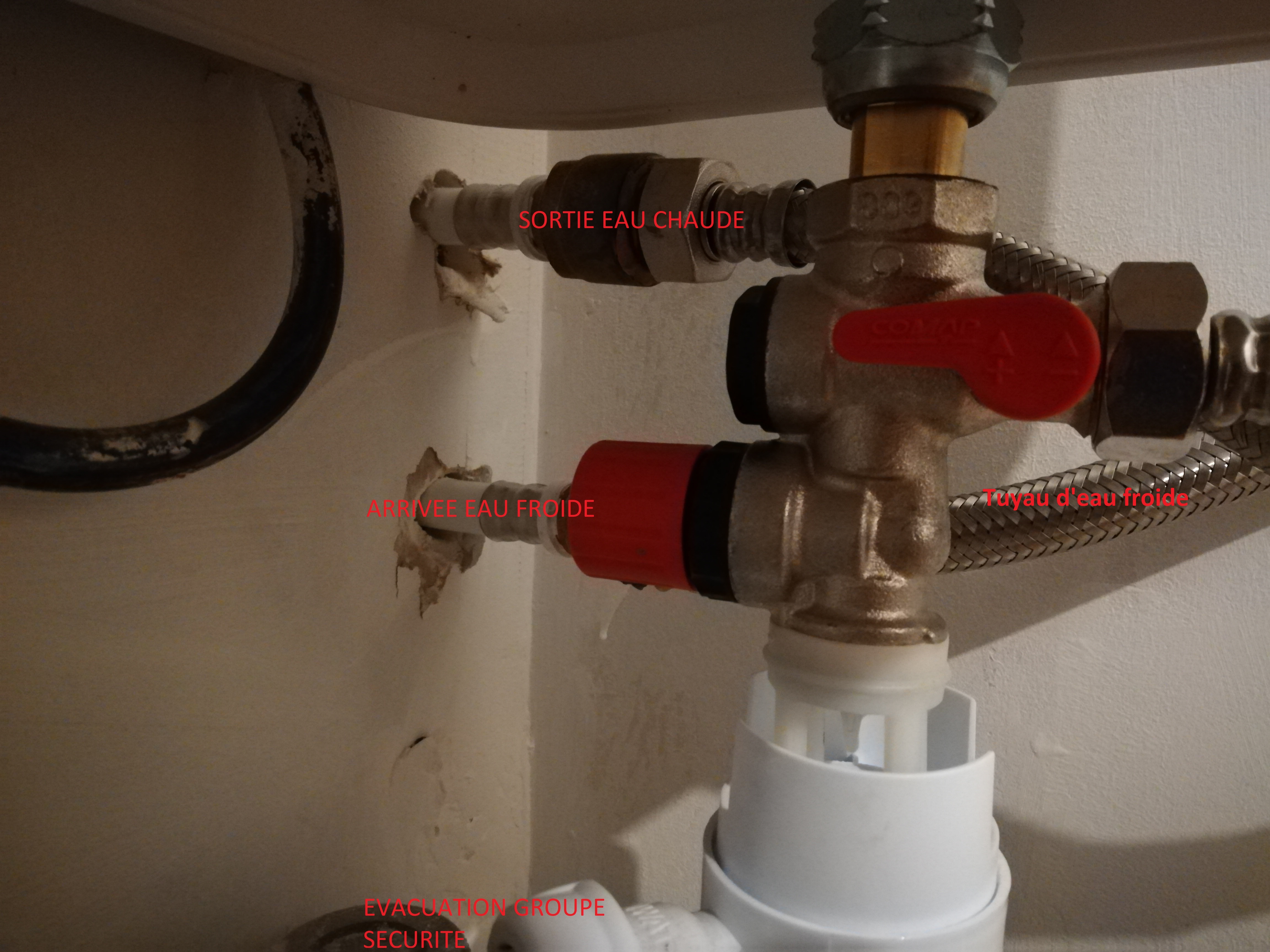 J'ai depuis deux ans un chauffe eau Atlantic Lineo de 65L qui fonctionne bien, mais depuis un peu plus d'une semaine, des bruits de claquement sont apparus au niveau de l'arrivée d'eau froide (pas directement sur le chauffe eau mais plus dans le tuyau de raccordement entre mon arrivée d'eau froide et le groupe de sécurité (cf photo). C'est des claquements comme un coup sur le tuyau qui arrivent un peu tout le temps (envrion 5-6 fois par heures) et surtout quand je n'utilise pas d'eau chaude et même d'eau tout simplement.