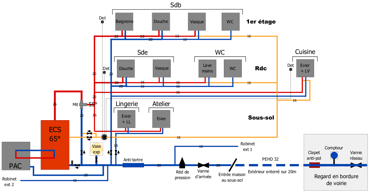 - j'ajouterai quelques vannes au niveau de chaque appareil sanitaire (je n'ai pas voulu surcharger le plan).