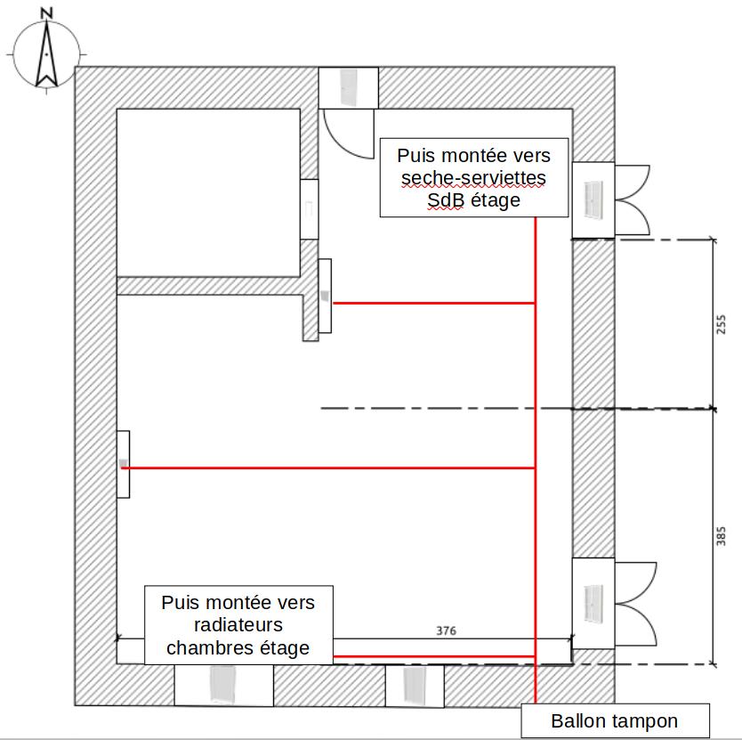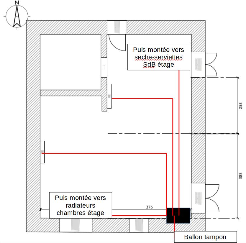 Le réseau se compose de 4 radiateurs (2 au RDC + 2 à l'étage) ainsi que d'un sèche-serviettes (également à l'étage). Les radiateurs ont été surdimensionnés pour ainsi être alimentés à "basse" température