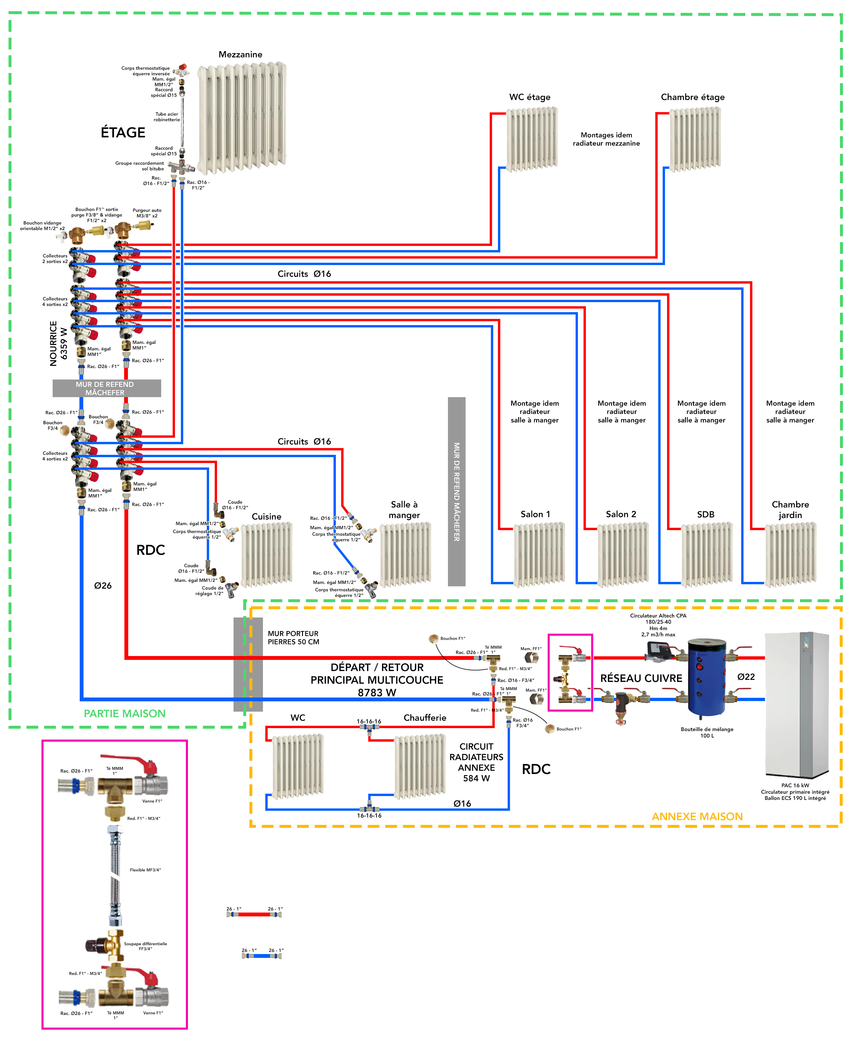 Désormais, j'ai déposé l'intégralité de l'installation acier donc je suis prêt à repartir proprement en multicouche en sortie de PAC. Une fois ce plan enfin validé, je me mettrai (enfin) à la mise en œuvre !