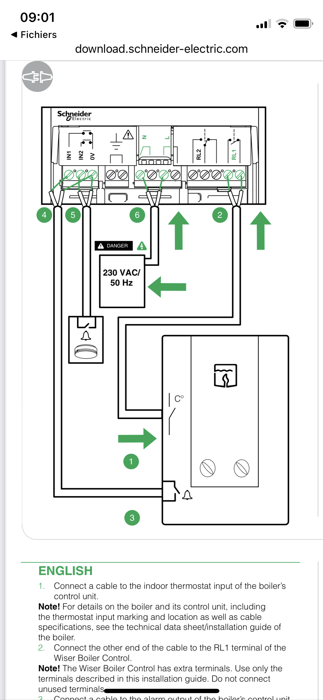 J’ai installé  un kit wiser de chez Schneider (l’ancien modèle), donc un boîtier principal à installer sur ma box internet, les vannes thermostatiques connectées qui vont avec sur tous mes radiateurs et maintenant j’arrive au thermostat à brancher sur ma chaudière et ça se complique!