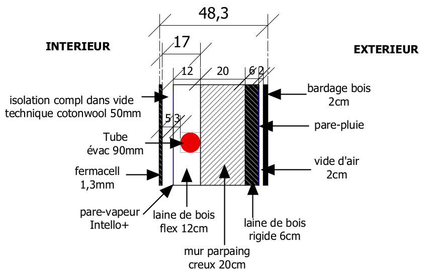Dans mon cas, je vais mettre en intérieur 12cm de laine de bois lambda 36, puis un frein vapeur hygrovariable Intello, puis de nouveau 5cm de laine de coton recyclé avant la plaque de Fermacell. Si mes plus gros tubes font 90mm de diamètre, j'aurai dans ce cas encore 8cm d'isolant par dessus. De plus, il y aura par la suite une seconde isolation par l'extérieur, d'ici un an. Je pense (j'espère !) que je n'aurai donc pas de pont thermique trop important à ce niveau. Ci-joint schéma de ce qui est prévu à terme si cela vous intéresse.