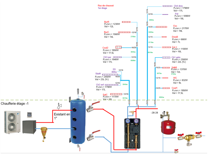 J’ai une PAC Daikin Altherma 16kW HT Inverter (ERSQ016AAV1 + EKHBRD016ACV1) de 2012, sans ECS (existante à l’achat de la maison mais n’avait jamais été utilisée). Installée à l’origine en relève de chaudière fioul (que j’ai supprimé). Il y a un ballon de découplage hydraulique de 50L et j’ai (pour l’instant) réutilisé sur le circuit secondaire un circulateur IMP 25/60 qui à 3 vitesses fixes (en vitesse mini). Volume d’eau du circuit juste pour les radiateurs sans la tuyauterie: 240L