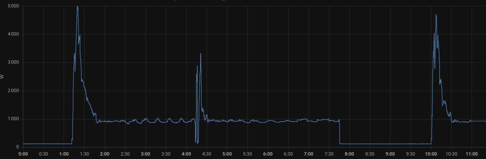 05 :00 un cycle plus long de 30min (pour passer du mode réduit au mode jour). On voit la modulation de puissance de l’inverter qui réduit la puissance au cours du cycle.