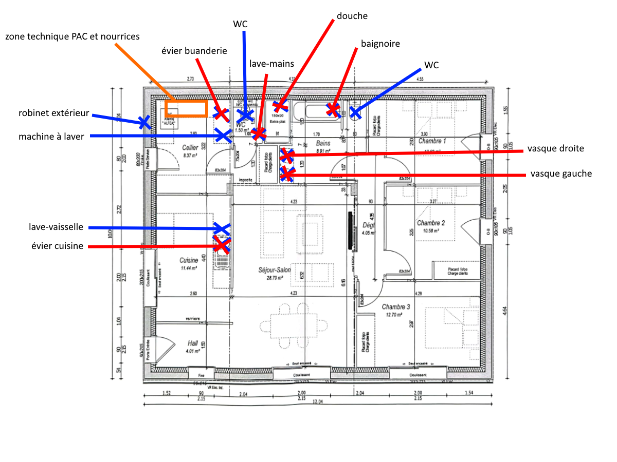 Il y aura peut être des modifications ultérieurement pour utiliser l'eau du puits pour les WC et le robinet extérieur.