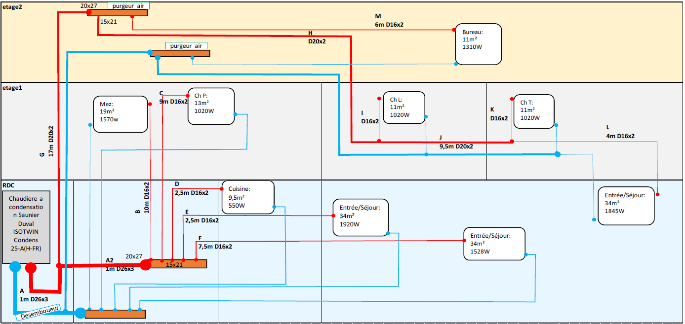 J'ai dimensionné les tubes suivant les infos trouvées sur ce forum (cf fichier joint) mais je me pose la question sur le diamètre du tube qui monte au 2nd étage, la puissance cumulée des radiateurs sur cette ligne est inférieure à 3500W donc un tube D20x2 est suffisant mais compte tenu de la longueur (17m environ) et des 2 étages à monter ne devrais je pas le passer en D26 x3 ?