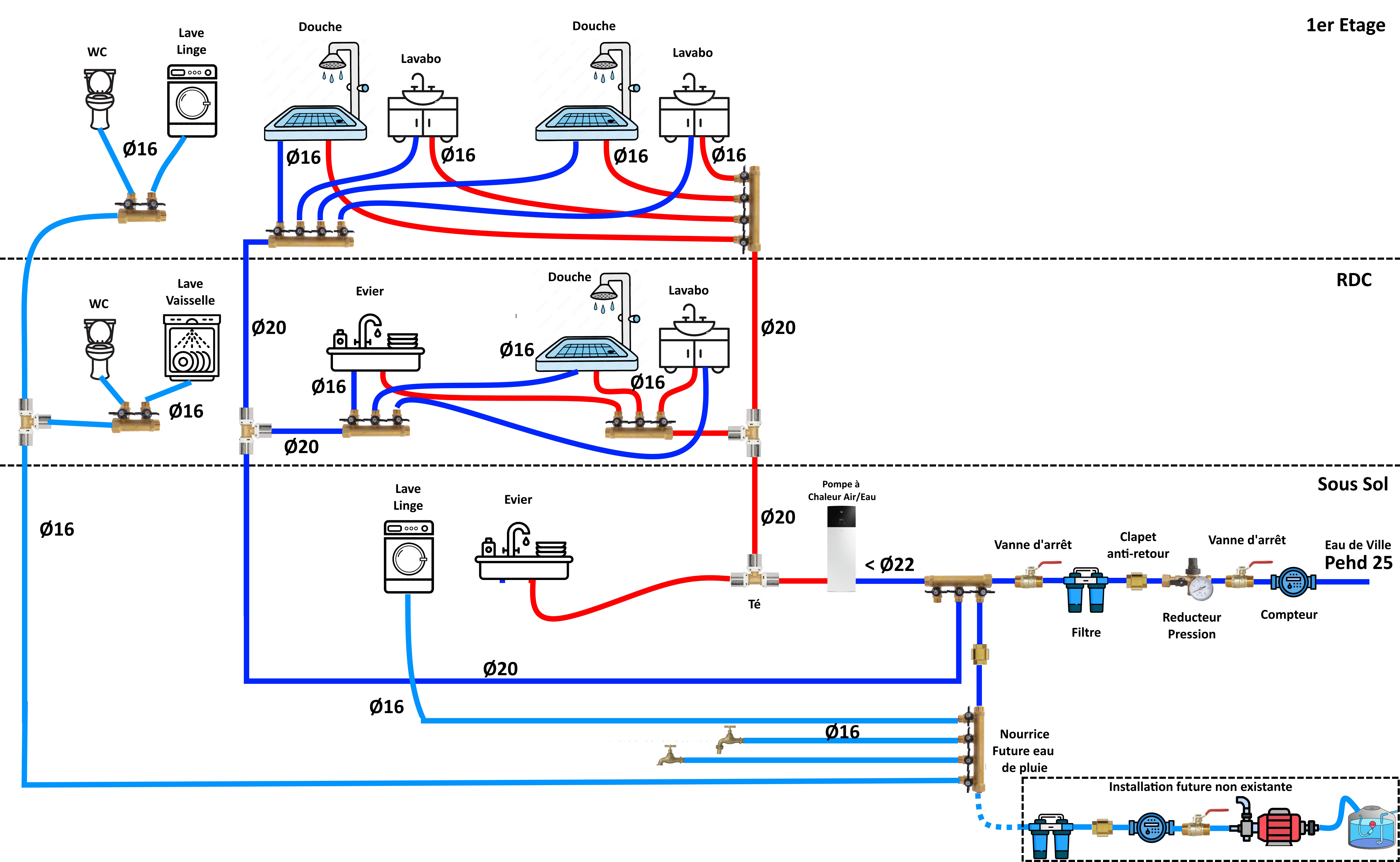 - le réseau en bas à droite pour l'eau de pluie c'est juste un idée pour le future (il y a rien aujourd'hui) mais je voulais créer un circuit pour WC et lave linge, lave vaisselle pour le future.