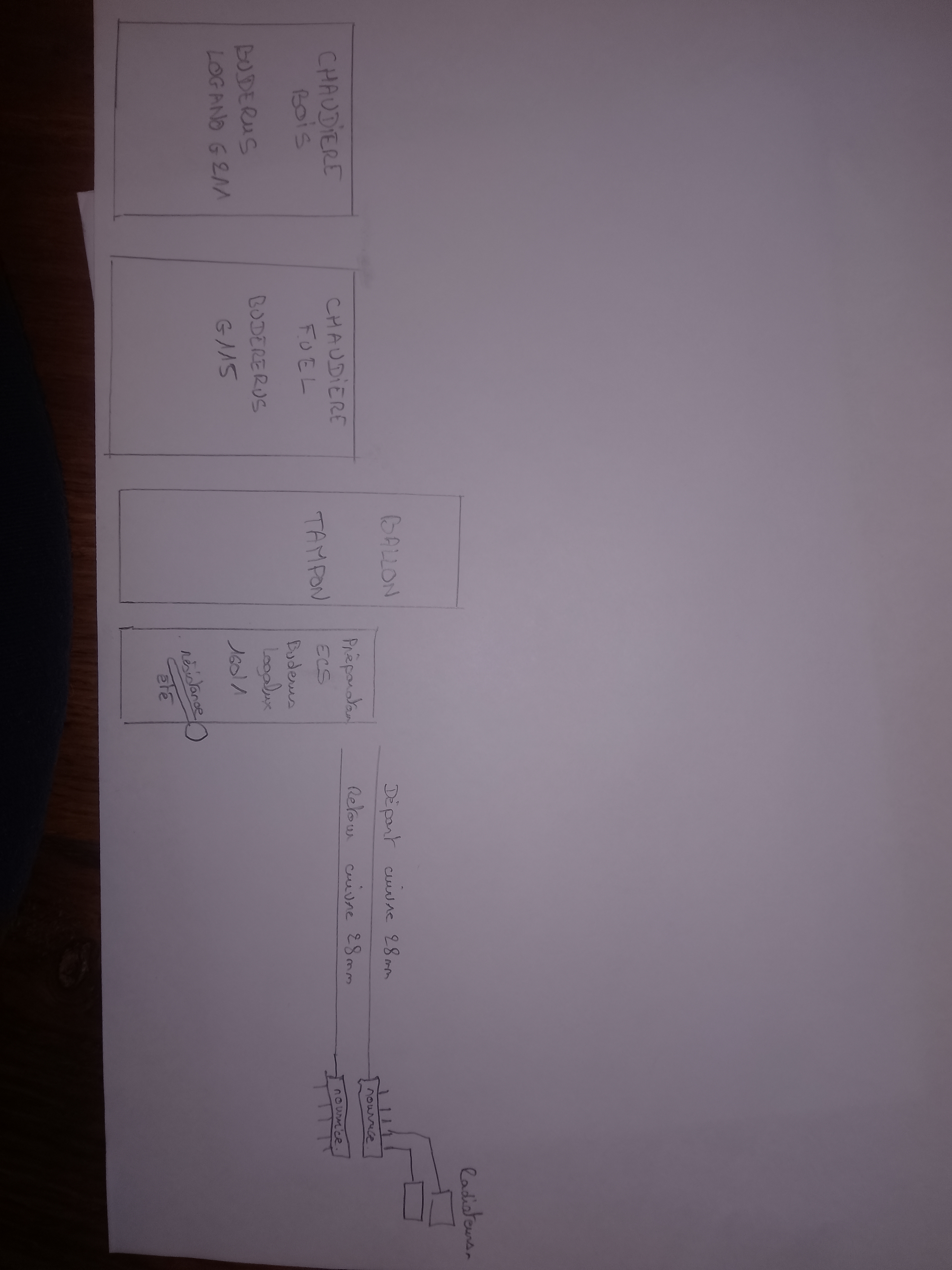 Bonsoir j'ai fait un schéma à peu près explicite de la disposition de mes chaudières ballon tampon etc par contre je n'ai pas de notions sur les ciculateurs , vannes mélangeuses ...bref tout ce qu'il faut pour que mon chauffage fonctionne bien!