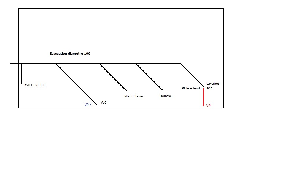 Dois-je obligatoirement placer ma ventilation primaire au point le plus haut de mon collecteur (en rouge sur mon schéma) où puis-je la mettre au niveau de mon WC (en violet sur le dessin) ? La seconde solution m'arrangerait fortement.