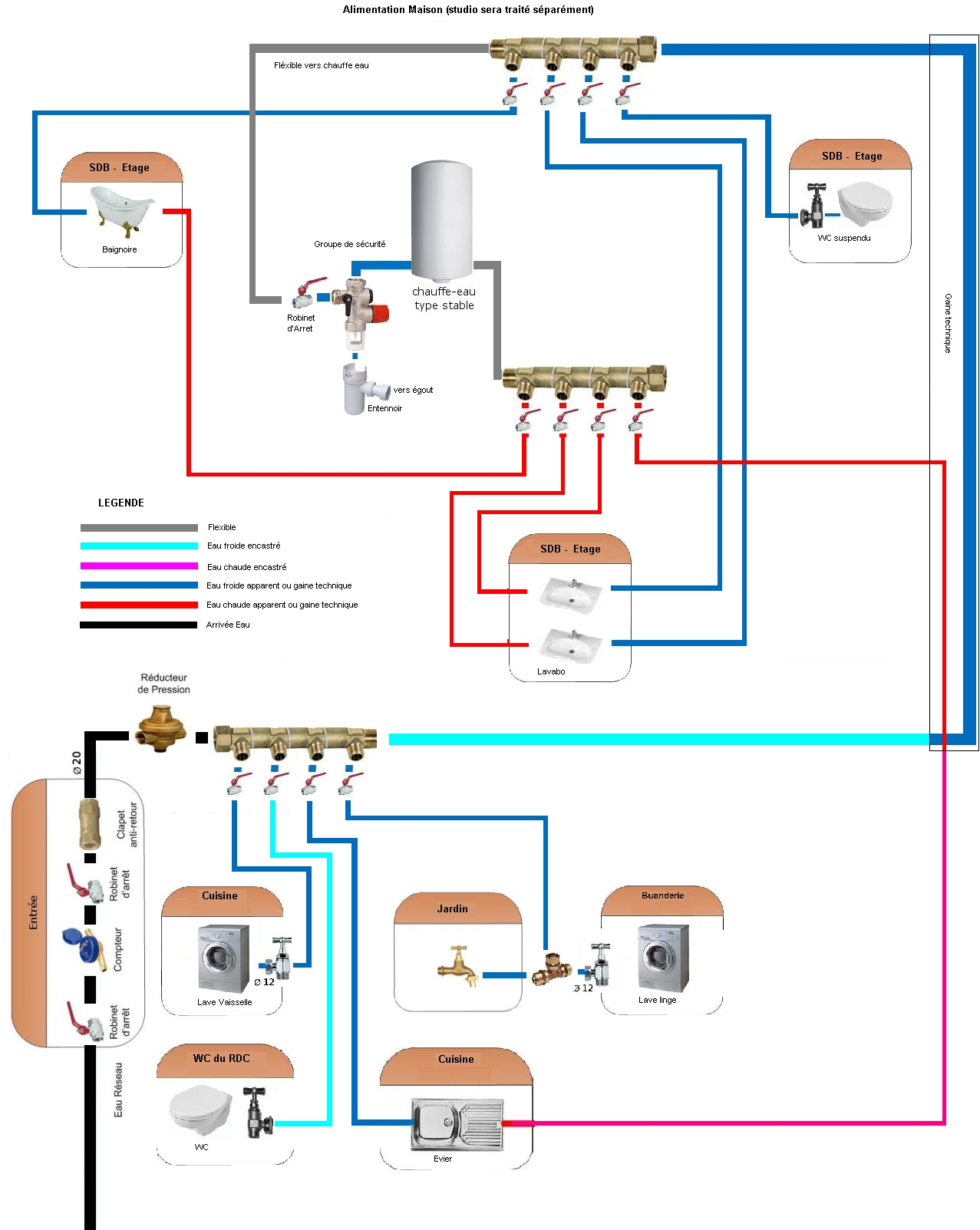 Le retour du chauffe eau alimente une nourrice qui dessert la baignoire, les 2 lavabos, et l'évier de la cuisine au RDC.