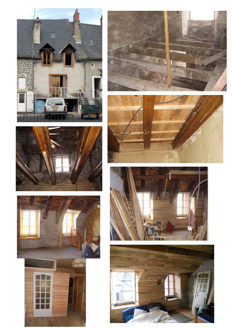 Comme tu le vois sur certaines photos avec mon épouse on a tout viré et refait 3 planchers qu'il n'y avait plus. On a tout refait complétement, l'isolation à la paille comme à l'ancienne bien bourrée, l'électricité au norme, la plomberie...