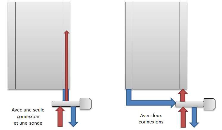 - soit une seule connexion vers le radiateur faisant l'entrée et la sortie, et une sonde remontant dans le radiateur
