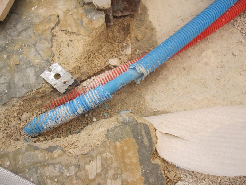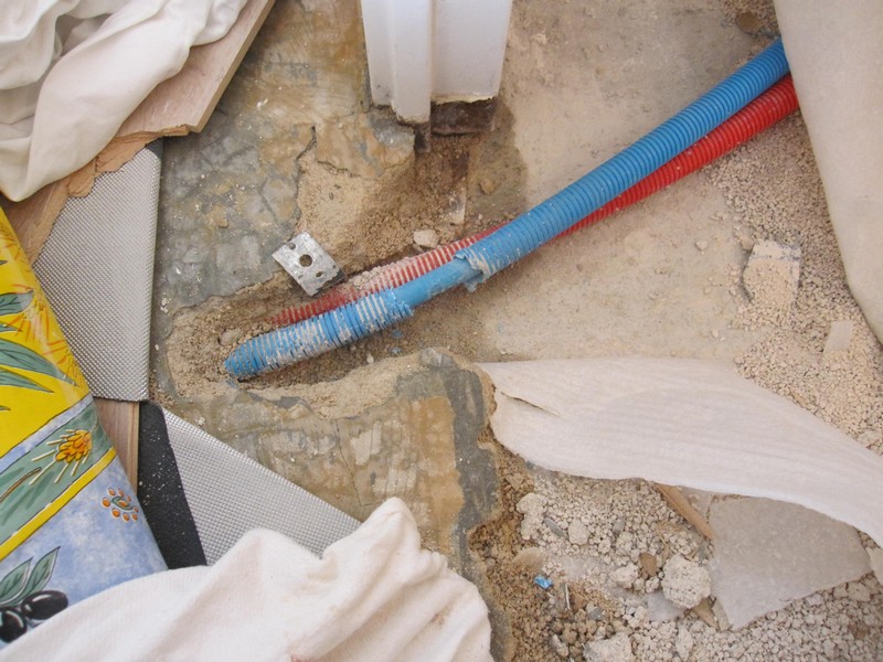 J'habite dans un appartement en premier étage. Nous avons décidé de refaire la salle de bain donc j'ai cassé l'ancienne. J'ai découvert que le couscous dans le sol semblait humide près de la porte de cette salle de bain. En regardant de plus près, on peut apercevoir que le seuil de porte en acier est rouillé. En cherchant encore je m’aperçois que la gaine cannelée bleue  est abimée, je me souviens que l'endroit en question correspond à un perçage 6 ans plus tôt lors de la mise en place d'un parquet.