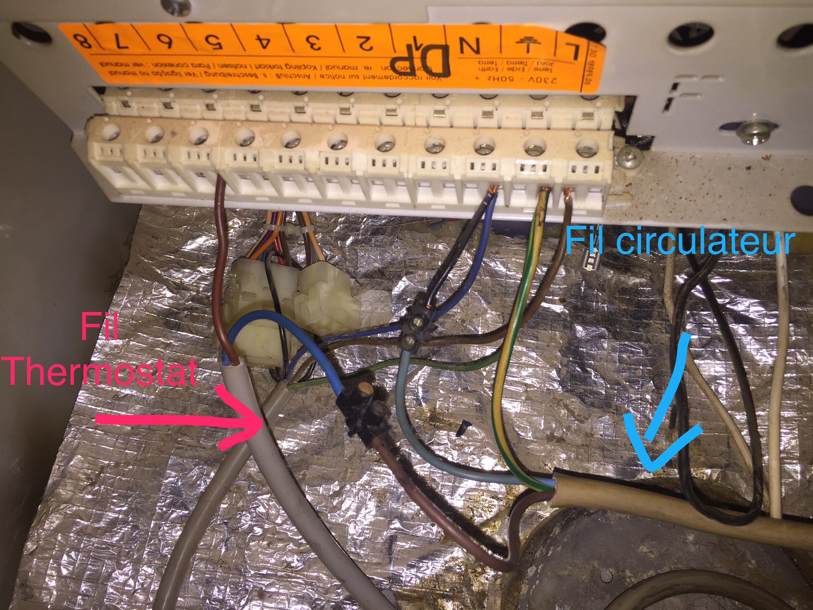 En suivant le forum, j'ai branché la phase ( fil marron du circulateur sur le neutre du thermostat fil bleu (no indiqué 1 sur mon thermostat).
