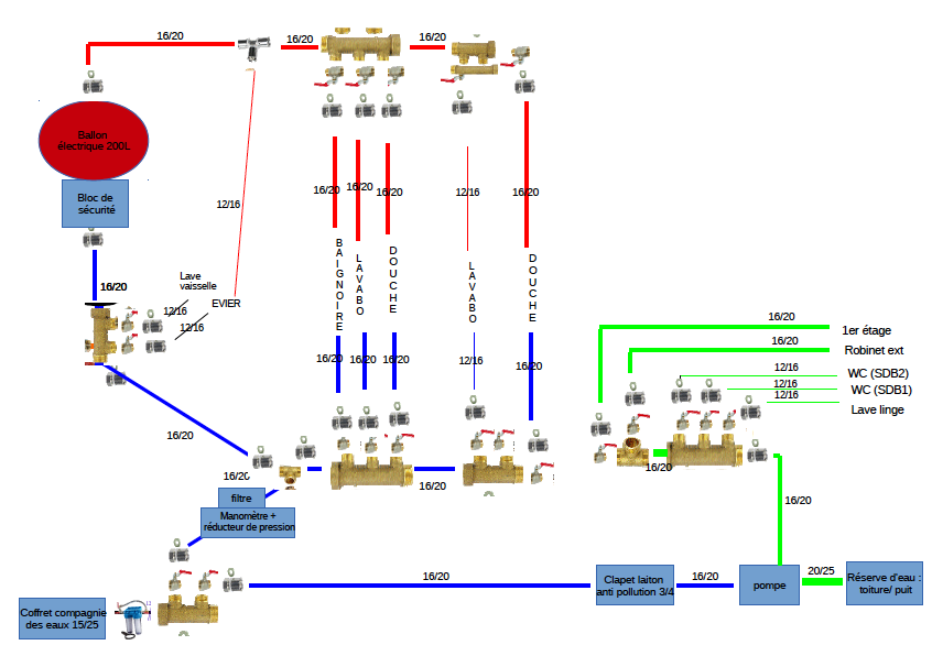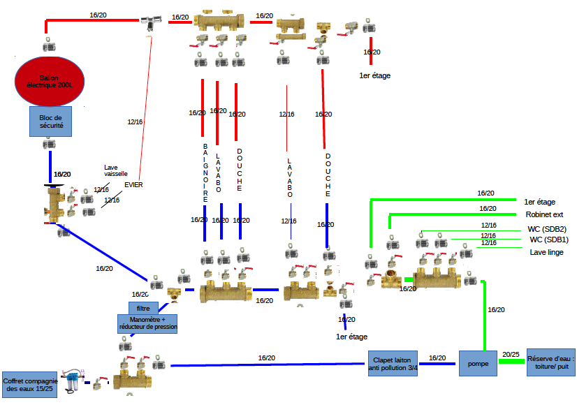 Je suis actuellement sur un projet familial qui consiste à rénover une grange de 150m carré et nous souhaiterions réaliser toute la plomberie à l’aide de multicouche à sertir. Etant débutant dans ce domaine je me permets de vous soumettre mon schéma d’installation afin d’avoir votre avis. Vous semble t’il donc correcte ?