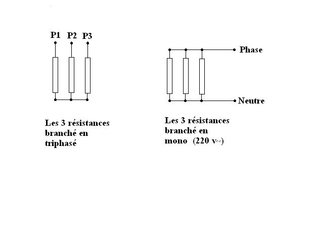 en tri les résistances sont branchées en étoile de façon qu'elles aient du 230 volts à leurs bornes.(entre 3 phases)