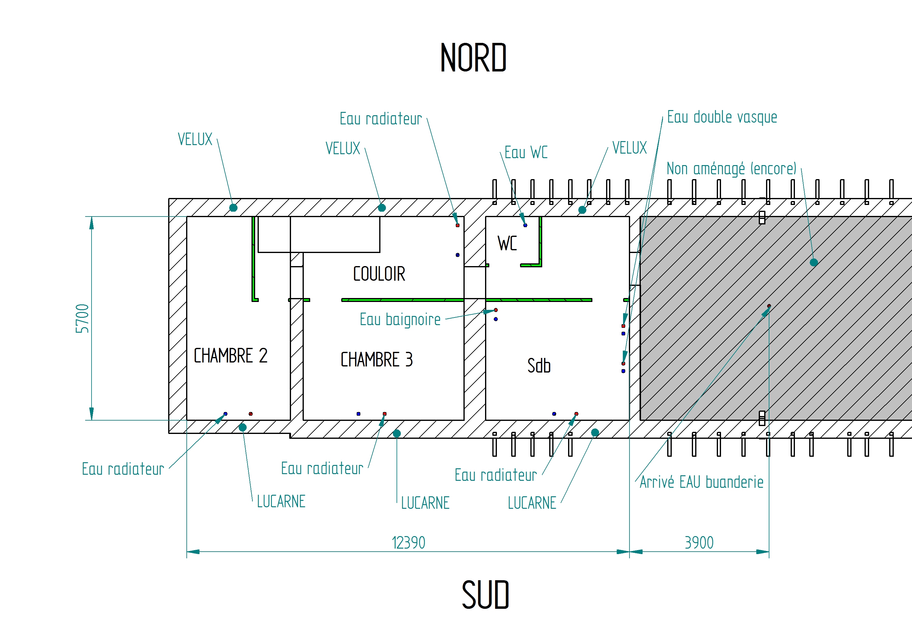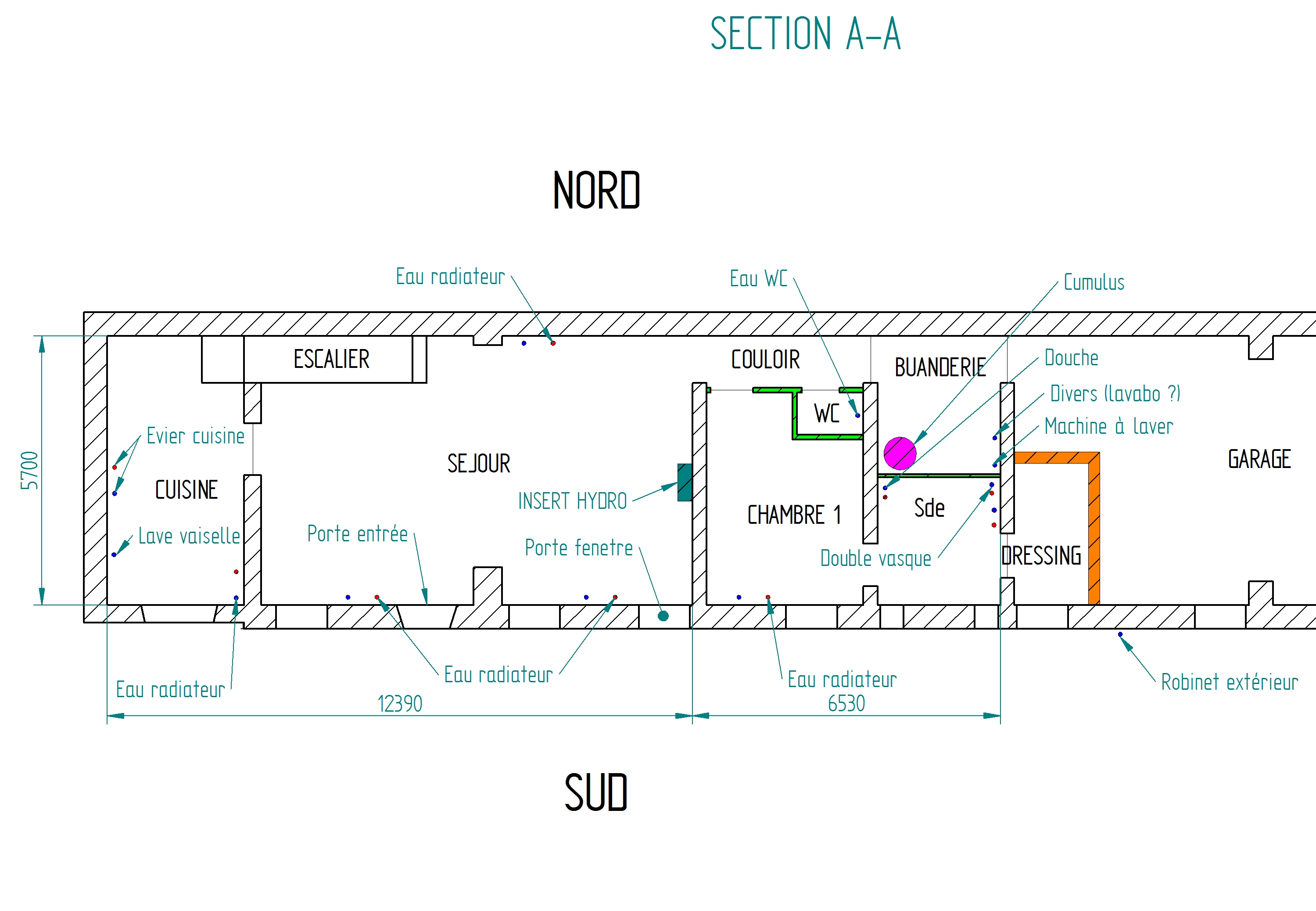 Arrivé d'eau venant du RDC en 1 seul endroit , les gaines caché dans l'isolation de mon plancher et se répartissent vers mes point d'eau.