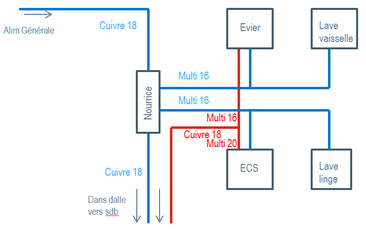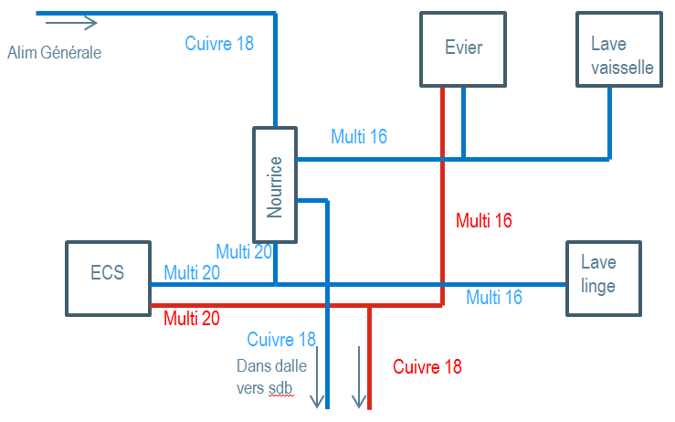Avant de venir ici, mon idée était d'installer une nourrice pour l'eau froide et de me servir du bout pour aller rejoindre la sdb également en cuivre. Je voulais ensuite utiliser 2 sorties pour alimenter d'une part le ballon de 200L et le lave linge en multicouche diamètre 16 et d'autre part l'évier et le lave vaisselle en multicouche 16 également.