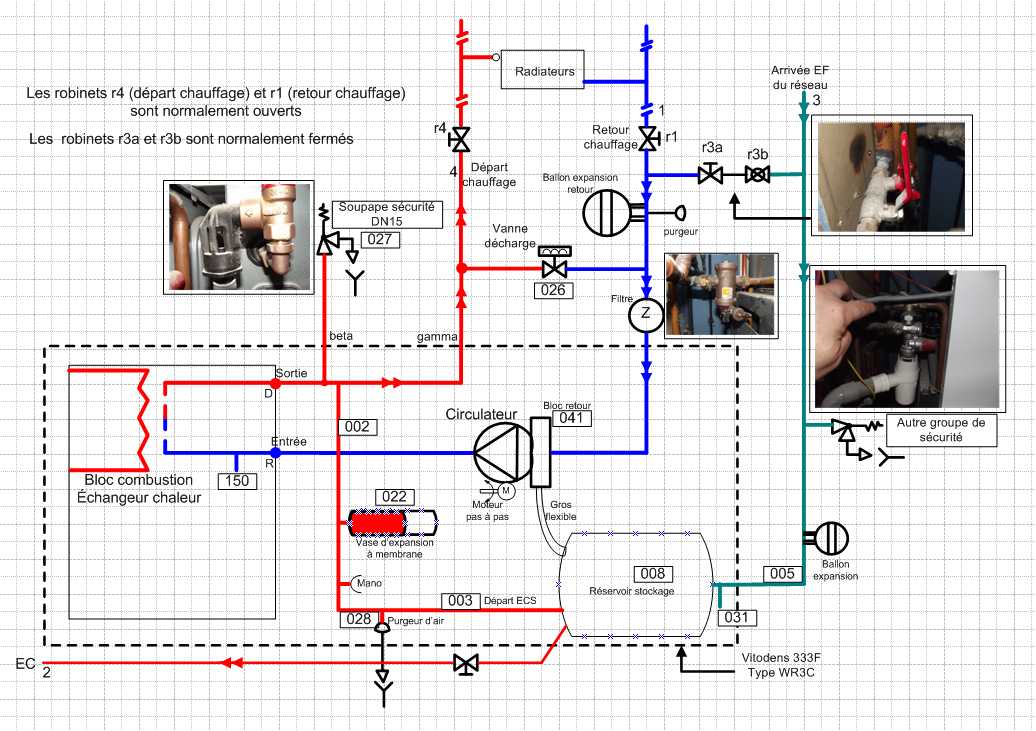 Pour aider tout contributeur à résoudre mon problème j’ai tiré quelques photos et j’ai réalisé, méticuleusement, tuyau par tuyau, en m’aidant de la nomenclature en ma possession, un schéma de mon installation. Pour essayer de comprendre aussi le fonctionnement de cette chaudière, à vrai dire !