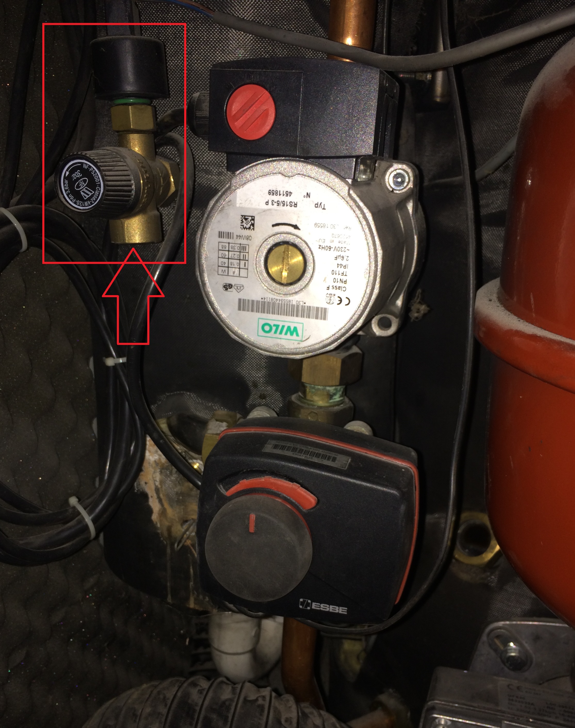 Je me suis permet de reprendre une photo présente à la première page de ce post, l'eau qui suinte provient de cette vanne de sécurité, mais j'ai "sécurisé" en y mettant un tuyau qui part à l'égout. Cela évitera la corrosion sur le chassis de la chaudière.