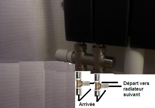 Pour le circuit bitubes, je dois mettre un T de raccordement mais j'aimerais que cela ne soit pas trop visible donc j'avais prévu de faire comme sur ci dessous. Le T raccordé sur la vanne en H. est ce que cela vous semble correct ou y a t'il d'autres solutions?